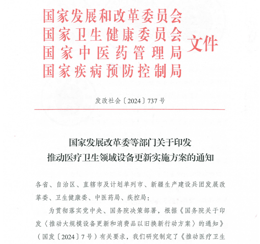 繼國(guó)務(wù)院印發(fā)《推動(dòng)大規(guī)模設(shè)備更新和消費(fèi)品以舊換新行動(dòng)方案》后,近日,國(guó)家發(fā)展改革委等部門印發(fā)《推動(dòng)醫(yī)療衛(wèi)生領(lǐng)域設(shè)備更新實(shí)施方案》(以下簡(jiǎn)稱《方案》),全面推進(jìn)醫(yī)療衛(wèi)生機(jī)構(gòu)裝備和信息化設(shè)施迭代升級(jí)。